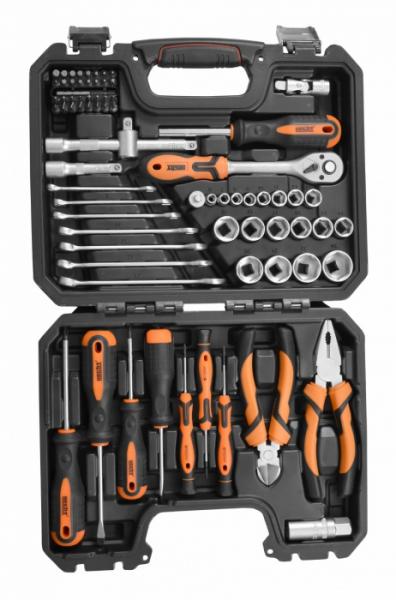 Komplekti kuuluvad: kruvikeerajad (rist ja tava), lehtvõtmed, padrunvõtmed, näpitstangid, lõiketangid, magnetiga otsikute hoidja, erinevad kruviotsikud,jne. Plastikust tööriistakast.