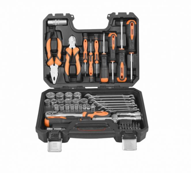 Komplekti kuuluvad: padrunvõtmed ja nende pikendused ning ostikud, magnetiga kruvikeeraja otsikute hoidja, erinevad kruviotsikud,jne. Plastikust tööriistakast.